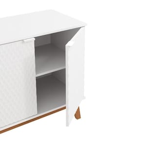 O corpo, com pintura na cor branca e acabamento brilho, possui superfície lisa, facilitando a limpeza. Já as portas, em MDF e acabamento BP em 18mm, também na cor branca, possuem detalhe em alto-relevo geométrico e amortecimento, completando a beleza do produto. Os puxadores metálicos facilitam o manuseio e garantem estilo à peça. Uma combinação clássica e elegante para todos os espaços e tipo de decoração.