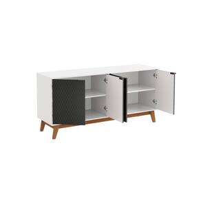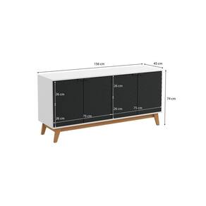 Acabamento: Pintura Brilho | Cor: Branco/Preto | Dobradiça: Com Amortecimento | Garantia: 3 meses para defeito de fabricação | Matéria-prima: MDF BP / MDP | Peso máximo suportado: 30kg | Peso suportado por cada prateleira: 7 kg | Puxadores: Metálicos | Quantidade de portas: 3 | Quantidade de prateleiras: 2 | Sistema de montagem: Parafuso Philips / Sistema Allen e Minifix | Tipo de porta: Bater | Quantidade de caixas da embalagem: 2 | Requer montagem: Sim | Inclui manual de montagem: Sim | Profundidade: 45cm | Altura: 74cm | Largura: 156cm | Formato do móvel: Aparador