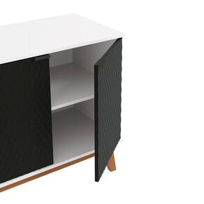O corpo, com pintura na cor branca e acabamento brilho, possui superfície lisa, facilitando a limpeza. Já as portas, em MDF e acabamento BP em 18mm, na cor preto fosco, possuem detalhe em alto-relevo geométrico e amortecimento, completando a beleza do produto. Os puxadores metálicos facilitam o manuseio e garantem estilo à peça. Uma combinação clássica e elegante para todos os espaços e tipo de decoração.