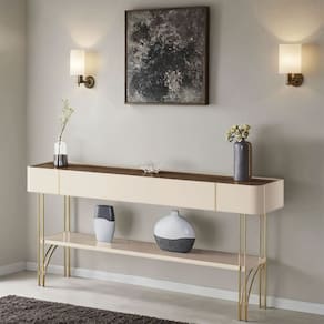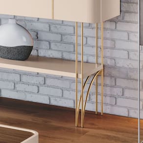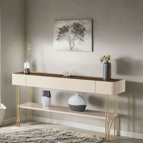 A prateleira inferior de 25mm oferece um espaço versátil para decoração ou organização, tornando-o ideal para halls de entrada, salas de estar e até como divisor de ambientes. Os pés de aço maciço com acabamento dourado conferem um toque refinado e exclusivo.
