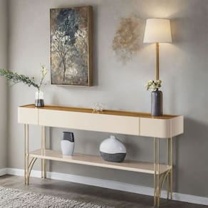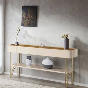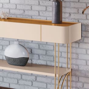 A prateleira inferior de 25mm oferece um espaço versátil para decoração ou organização, tornando-o ideal para halls de entrada, salas de estar e até como divisor de ambientes. Os pés de aço maciço com acabamento dourado conferem um toque refinado e exclusivo.