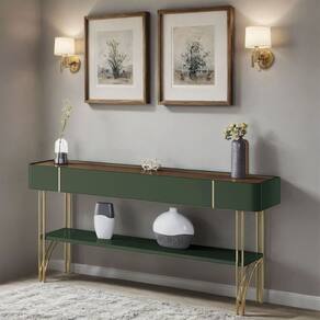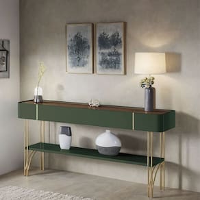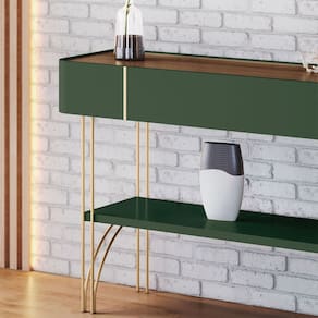 A prateleira inferior de 25mm oferece um espaço versátil para decoração ou organização, tornando-o ideal para halls de entrada, salas de estar e até como divisor de ambientes. Os pés de aço maciço com acabamento dourado conferem um toque refinado e exclusivo.