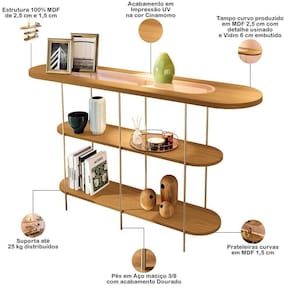 02 prateleiras curvas em MDF 15mm, com amplo espaço para objetos decorativos, livros e outros itens.