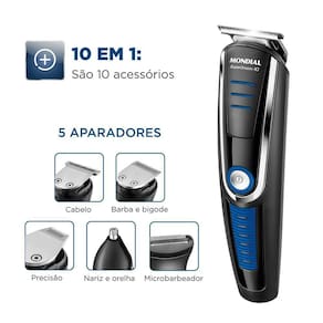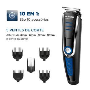 Aparador de Pelos Mondial BG-03 Super Groom 10 em 1, Recarregável Bivolt Aparador de Pelos Mondial BG-03 Super Groom 10 em 1, Recarregável Bivolt Barbear e aparar os pelos torna-se uma tarefa fácil com o Aparador de Pelos Mondial Super Groom10 10 em 1 Bivolt BG-03. Com maior precisão, sem perder a suavidade, ele vem com 10 acessórios, muito mais completo para você aparar a barba, cabelo, bigode, nariz, orelha e o corpo todo. Projetado para facilitar o corte e aparar áreas delicadas, suas lâminas são de aço inox, garantem maior durabilidade e alta performance para um corte rente, preciso e sem irritar a pele. Características: - 10 Em 1: Aparador de cabelo, Aparador de barba e bigode, Aparador de precisão, Micro barbeador, Aparador de nariz e orelha, 4 Pentes de corte, 1 Pente com regulagem de altura com 16 comprimentos - Lâminas em Aço Inox - Bateria com autonomia de 90 minutos - Uso sem fio - Base carregadora/organizadora, Luz indicadora de carregamento- - Design Moderno Especificações: - Voltagem: Bivolt - Potência: 6W - Consumo: 0,006 Kw/h Conteúdo da embalagem: - 1 Aparador de Pelos Completo - 4 Cabeças Aparadoras - 4 Pentes de Corte - 1 Base Carregadora - 1 Pente Ajustável - 1 Óleo Lubrificante - 1 Carregador - 1 Manual de Instrução