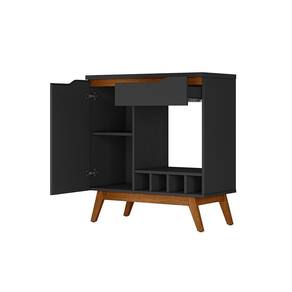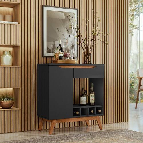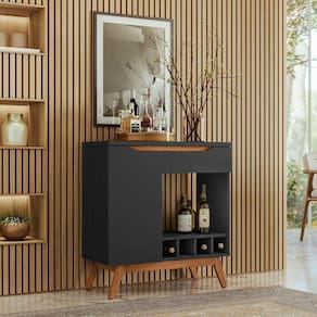 O Aparador Retrô Adega Tóquio, possui o tampo de 25 mm. A porta e a gaveta possuem usinagem que serve como puxadores, as dobradiças e corrediças são metálicas. Possui também uma adega para 04 garrafas de vinho, e mais um compartimento aberto para colocar objetos para seu barzinho. Os pés são chassi envernizado, um produto ótimo que serve para você colocar em um ambiente como aparador e ao mesmo tempo como um buffet com adega.Tipo: Aparador adegaModelo: TóquioCor: PretoMedidas (LXPXA):80CM X 37,1CM X 85,6CMCARACTERÍSTICAS:Acabamento: Pintura UVEscala de brilho: AcetinadoEstrutura: MDP E MDF 15/25MMPeso máximo suportado (kg): 32KGProduto necessita de montagem? SimQuantidade de pés: 4Tipo dos pés: Pés de PinusQuantidade de gavetas: 1Tipos de corrediças: MetálicasQuantidade de portas: 1Tipos de porta: RotaçãoTipos de dobradiças: MetálicasPrateleiras: 2Nichos:3Recomendações de manutenção: Pano úmido. Não aplicar lustra móveis.Garantia: 3 mesesATENÇÃOIMAGENS MERAMENTE ILUSTRATIVAS REALIZADO EDIÇÃO, PODENDO HAVER UMA PEQUENA VARIAÇÃO DE COR DEPENDENDO DE CADA TELA OU MONITOR.Aparador Retrà Adega Toquio - Preto