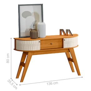 Feito em MDP 15/25mm. Possui 1 prateleira para acomodar objetos decorativos, 2 portas curvas em MDF e 1 gaveta com corrediça telescópicas