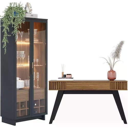 Aparador Riveira E Cristaleira Guanabara, é uma excelente escolha para compor a sua sala de estar ou jantar tornando o ambiente muito mais elegante. Estrutura em MDP de 15 e 25 mm, acabamento em pintura UV (Fosco/Brilho). Composta por portas com dobradiças metálicas, frentes das portas em vidro, prateleiras de vidro iluminadas por fitas de LED, adega com espaço para 10 garrafas, gaveta interna com corrediças telescópicas para guardar travessas e aparelhos de jantar, puxadores, e acompanham sapatas plásticas. Aparador conta com tampo espaçoso, ripas decorativas em suas laterais, gaveta multi com corrediças telescópicas, puxador, pés em Madeira Maciça, e acompanham sapatas plásticas. Estes móveis chegarão na sua casa separado em 04 volumes.