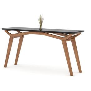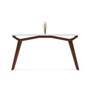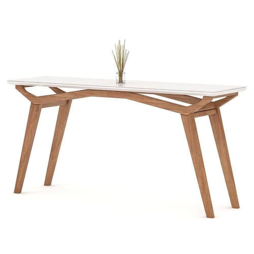 Fabricado em madeira de eucalipto com tampo em MDF laqueado e vidro pintado e colado sobre o tampo. Uma peça com desenho leve e delicado.