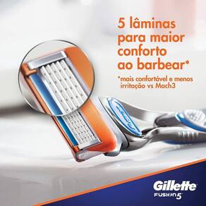 Aparelho de Barbear Gillette Fusion 5 Tradicional Para um barbear mais confortável e com menor irritação a Gillette apresenta a a linha Fusion que possui 5 lâminas para um barbear de detalhe. O Aparelho Gillette Fusion 5 Tradicional, é a versão básica da família Fusion. O Aparelho de Barbear Gillette Fusion 5 possui, ainda, lâmina de precisão, que é perfeita para lugares de difícil acesso como as costeletas e sob o nariz com uma faixa de lubrificação que fica branca indicando quando o barbear não é mais ideal. 5 lâminas para um barbear mais confortável Melhoria na faixa de lubrificação com aloe, vitamina Ação de pivotamento aprimorada Revestimento de faca aprimorado Capa mais avançada Barbear mais confortável e com menos irritação Vc. Mach3 Microtensores flexíveis Folha de precisão