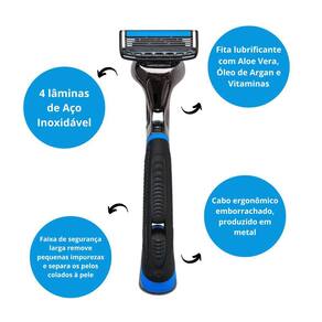 O Aparelho de Barbear The Razor4 é um de aparelho de barbear especialmente desenhado para quem tem barba mais espessa ou não se barbeia com muita frequência — e, por isso, precisa de mais espaçamento entre as lâminas. Suas 4 lâminas em Aço Inoxidável deixam passar pelos mais grossos e compridos na hora do corte e facilitam a remoção posterior. The Razor4 tem ainda cabo ergonômico emborrachado, faixa de segurança, fita lubrificante e um Trimmer, lâmina extra superafiada para detalhes.