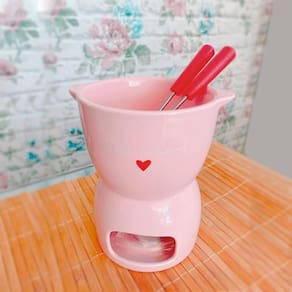 O kit possui uma base também em cerâmica, dois garfos com cabo em polipropileno vermelho e lâmina em inox e uma vela que é utilizada para manter a temperatura de seu chocolate ou queijo.