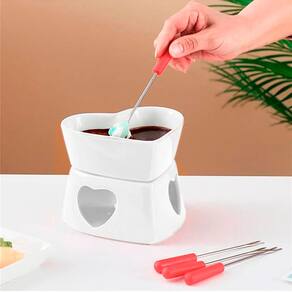 Fondue da Hauskraft é composto por 7 peças, ideal para o preparo de Fondue de Queijo e Chocolate. Possui um Bowl branco em formato de coração em cerâmica de ótima qualidade, com design moderno que tornará seu jantar em família muito mais especial. O kit possui uma base de cerâmica, quatro garfos com cabo em polipropileno vermelho e lâmina em inox e uma vela, ideal para quatro pessoas.