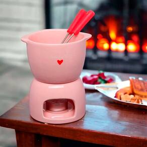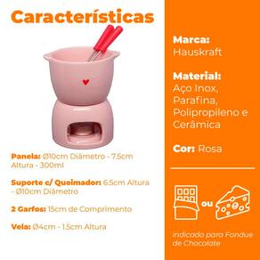 O Fondue da Hauskraft é composto por 5 peças, ideal para o preparo de Fondue de Queijo e Chocolate. Possui uma panela rosa em cerâmica de ótima qualidade, com design moderno que tornará seu jantar a dois muito mais especial. O kit possui uma base também em cerâmica, dois garfos com cabo em polipropileno vermelho e lâmina em inox e uma vela que é utilizada para manter a temperatura de seu chocolate ou queijo. Para utilizá-lo basta derreter o chocolate ou queijo em banho maria, e colocar uma vela no queimador para manter a temperatura