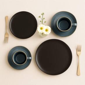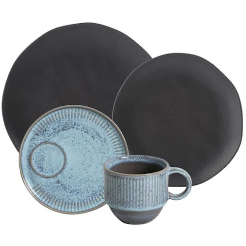 Garantia: 90 dias / Peso total: 9,768Kg / Cor predominante: preto e azul / Ref: 7794464255146 Dimensões de cada prato raso: 26,5cm (D) x 3cm (A); Dimensões de cada prato de sobremesa: 19cm (D) x 2cm (A); Dimensões de cada xícara: 8cm (D) x 7,5cm (A); Capacidade de cada xícara: 230ml; Dimensões de cada pires: 15,5cm (D) x 1,5cm (A); Conteúdo: 6 pratos rasos, 6 pratos de sobremesa, 6 xícaras e 6 pires; Material: - Cerâmica Stoneware (grés), de alta resistência que passa por queima especial e acabamento manual, garantindo durabilidade e um visual exclusivo em cada item; - Esmalte reagente: cobertura vítrea aplicada a cerâmicas, que reage quimicamente durante a queima no forno, criando efeitos únicos de cor, textura ou acabamento. É papel importante na identidade do produto; Limpeza e cuidados: - Não expor o produto diretamente ao fogo ou a fontes de calor intensas; - Para limpeza profunda, use uma esponja multiuso e saponáceo; - Pode ir ao forno, micro-ondas, lava louças e freezer; - Suporta até 180C, não expor a troca de calor direta; - Não utilizar produtos químicos e abrasivos.