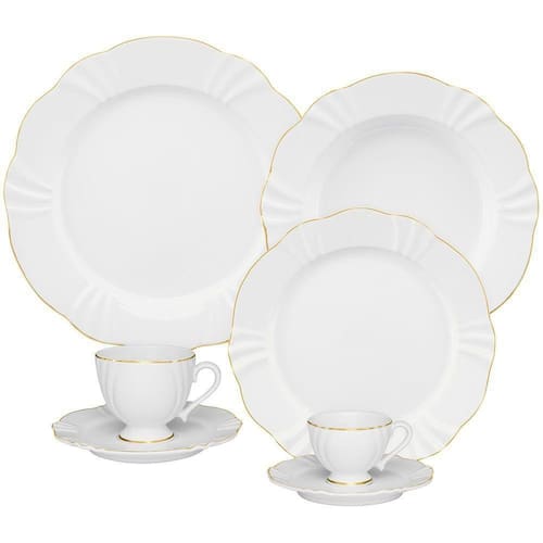 Aparelho de Jantar Soleil Victória 42 Peças Oxford O ouro, símbolo de luxo e riqueza, está presente em delicados filetes que contornam as peças do aparelho de jantar Soleil Victória da Oxford. E a louça branca é perfeita para quem quer deixar o destaque da refeição para comida servida. Na medida para quem busca requinte sem abrir mão da discrição. Aparelho de Jantar Soleil Victória 42 peças Oxford - Incluso 6 Pratos Rasos - 29 cm 6 Pratos Fundos - 24 cm 6 Pratos Sobremesa - 23 cm 6 Pires De Chá - 17 cm 6 Xícaras De Chá - 200 ml 6 Pires De Café - 13 cm 6 Xícaras De Café - 75 ml Aparelho de Jantar Soleil Victória 42 peças Oxford - Informações Uso: Não pode ser utilizado no micro-ondas e na lava-louças Material: Porcelana Formato: Sinuoso Decoração: Liso com filete em tinta ouro Cor: Branco