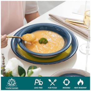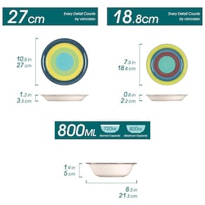 O conjunto de louça vancasso arco com design exclusivo e arrojado adota um design arrojado pintado à mão, seis tipos de cores vivas alternadas entre si, o que apresenta um efeito de arco íris natural. As cores brilhantes criam uma bela paisagem de mesa para qualquer ocasião e, quando não estão em uso, são uma exibição impressionante dentro de uma cristaleira de cozinha. Serviço de jantar de 18 peças O conjunto de jantar de 18 peças inclui 6 pratos de jantar, 6 pratos de sobremesa e 6 tigelas de macarrão. . Esta coleção completa é perfeita para Saladas, Sopas, Sobremesas, Entradas e Aperitivos. Portanto, definitivamente fornecerá a você uma experiência gastronômica inesquecível, seja em eventos formais ou casuais. E você também pode coordenar o seu serviço de jantar com a estética atual da sua cozinha Louça de grés durável que pode ir à lava louças no micro ondas Feito de grés denso mais cuidadosamente selecionado, preparado e misturado, queimado duas vezes em altas temperaturas para torná lo forte para resistir ao micro ondas, lava louças . Graças às características não porosas e densas, o grés também distribui e retém o calor de forma mais uniforme do que outros tipos de cerâmica Material Mão de obra requintada Faiança de inspiração artesanal O conjunto de louça Arco não contém grafite nem cádmio e não absorve odores ou bactérias dos alimentos, garanta a sua dieta saudável. O grés forte e duradouro é queimado a alta temperatura para maximizar a resistência da porcelana. Vai com segurança no freezer, lava louças e micro ondas Os conjuntos de jantar Vancasso de aplicação ampla combinam perfeitamente com o uso diário da família e têm excelente uso em qualquer reunião familiar, restaurante, banquete formal. Não apenas adequado para uso familiar, mas também como um ótimo presente ideal para decoração de casa, inauguração, casamento, aniversário, reunião de família ou qualquer outra festa