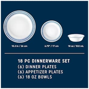Traga estilo atemporal e clássico para sua experiência gastronômica com este conjunto de jantar Corelle. Composto por 18 peças, incluindo seis pratos rasos , seis pratos de sobremesa e seis tigelas de sopa/cereal.Com um design elegante em azul clássico, este conjunto é funcional, resistente a quebras, leve e empilhável. Seguro para lava-louças, pode ser utilizado no micro-ondas e forno. Um conjunto completo e de baixa manutenção para 6 pessoas, que traz o estilo clássico da Corelle para sua mesa.