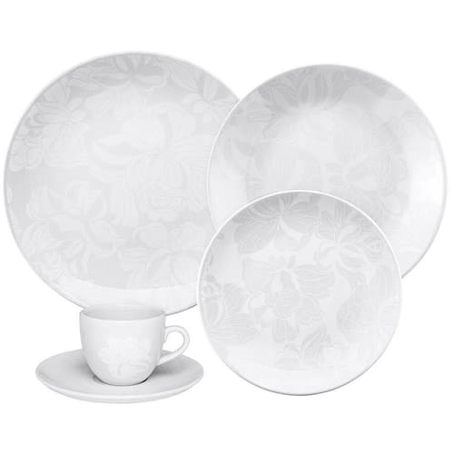 O conjunto conta com 4 pratos rasos, 4 pratos fundos, 4 pratos de sobremesa, 4 xícaras de chá e 4 pires de chá