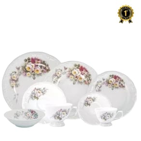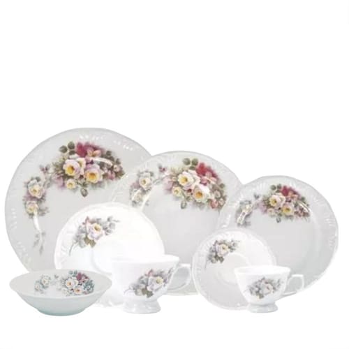 O conjunto é composto por 48 peças, incluindo 6un xícaras de chá, 6un Xícaras de Café, 12 pires, 6un pratos rasos, 6un pratos de sobremesa e 6un pratos Fundo,6un saladeirinha com 200ml cada. Todas as peças são fabricadas em porcelana de alta qualidade, que garante durabilidade, resistência e beleza.