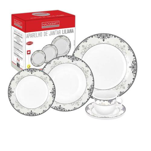 O aparelho de jantar da hauskraft do modelo Liliana vai trazer à sua mesa mais charme e sofisticação nos momentos de suas refeições, suas peças são confeccionadas em porcelana e trabalhadas no formato redondo o que as torna ainda mais especiais, por serem peças de altíssima qualidade e durabilidade. Este conjunto de porcelana tem de tudo para melhorar suas reuniões, comemorações e cerimônias. É composto por 20 peças, sendo 4 pratos de sobremesa, 4 pratos rasos, 4 pratos fundos, 4 xícaras e 4 pires, todos com desenhos florais pretos em suas bordas para agregar na decoração de sua mesa posta!