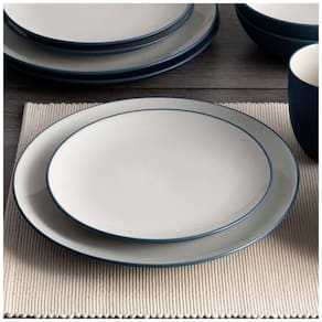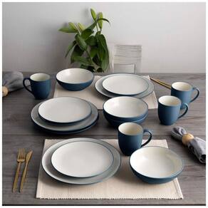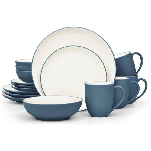 O conjunto de 16 peças inclui pratos de jantar, pratos de salada, tigelas e canecas na coleção Colorwave Blue, servindo 4 pessoas.