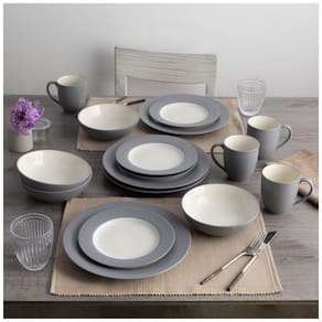 O conjunto de 16 peças inclui pratos de jantar, pratos de salada, tigelas e canecas para 4 pessoas.