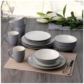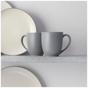 O conjunto Noritake Colorwave Slate de 16 peças serve 4 pessoas e inclui 4 pratos de jantar, 4 pratos de salada, 4 tigelas e 4 canecas em formato cupê, na cor cinza ardósia.
