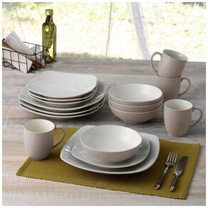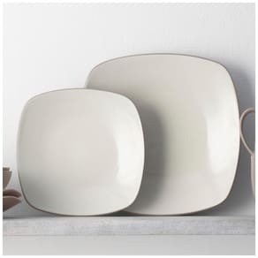 O conjunto Colorwave de 16 peças da Noritake inclui louça quadrada para 4 pessoas, com 4 pratos de jantar, 4 pratos de salada, 4 tigelas e 4 mini travessas.