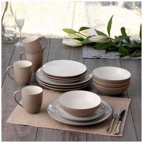 O conjunto Colorwave de 16 peças serve 4 pessoas e inclui 4 pratos de jantar, 4 pratos de salada, 4 tigelas e 4 canecas.