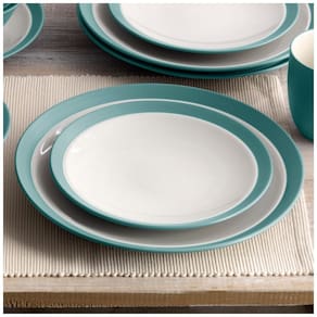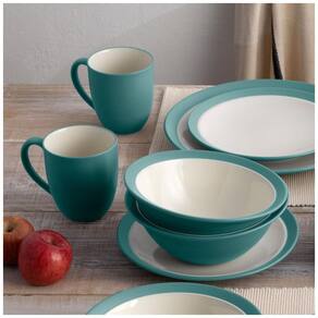 O conjunto Noritake Colorwave Turquoise de 16 peças serve 4 pessoas e inclui 4 pratos de jantar, 4 pratos de salada, 4 tigelas e 4 canecas em formato curvado