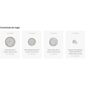 CONTEÚDO - 4 Conjunto Xícara e Pires 200 ml - 96580083 - 4 Prato Fundo 21 cm - 96580082 - 4 Prato Raso 25 cm - 96580080 - 4 Prato Sobremesa 19 cm - 96580081
