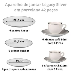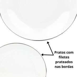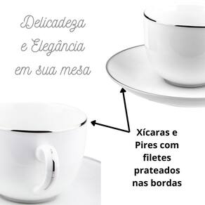 Esse conjunto conta com um design charmoso e elegante, com filetes prateados que agregam um toque de sofisticação à sua mesa. Ele é composto por 6 pratos rasos de 26,5cm, 6 pratos fundos de 20,5cm, 6 pratos para sobremesa de 19cm, 6 xícaras de café de 90ml com 6 pires e 6 xícaras de chá de 220ml com 6 pires.