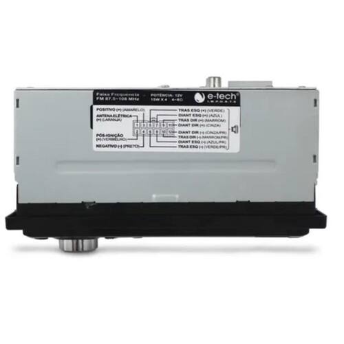 Especificações técnicas mp3 player: - produto: novo - marca: e-tech - modelo: radio light bt - et-mp3 06 - conexão para músicas e ligações - reproduz usb, sd, mmc com seleção de pastas - 18 memórias fm - função relógio - 2 saídas rca - potência de saída máx: 4 x 15w - iluminação dos botões e display na cor vermelha - conexões usb e cartão sd - entrada auxiliar conexão stereo padrão p2 - rádio com 18 memórias de fm faixa de frequência 87,5 mhz 108 mhz - pré ajustes de equalização pop, rock, e classic - função mudo - função relógio - 4 saídas a fio 4 x 15w e 2 saídas em rca - conexão para ligações músicas co telefones celulares recurso opcional, consulte versão do aparelho