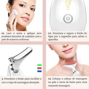 Aparelho Tratamento Massageador Facial Led Lift FototerapiaRevolutionize sua rotina de skincare com o Aparelho Tratamento Massageador Facial Led Lift Fototerapia. Compacto, moderno e eficaz, é o parceiro ideal para quem busca um tratamento estético completo no confort de casa.Combinando fototerapia, vibração sônica e aquecimento, o aparelho estimula a produção de colágeno, reduz rugas e papadas, melhora a firmeza da pele e proporciona uma aparência mais jovem e saudável.Características Principais:* Tecnologia LED com 3 cores:+ Luz vermelha): rejuvenescimento e produção de colágeno+ Luz azul: controle da oleosidade e acne+ Luz verde: clareamento e equilíbrio da pele* Função vibratória de alta frequência: ativa a circulação e promove relaxamento muscular facial* Aquecimento inteligente até 45°C: dilata os poros e melhora a absorção de produtos* Design ergonômico e portátil: leve e fácil de manusear, ideal para o uso diário* Bateria recarregável via USB: praticidade para usar em qualquer lugar* Desligamento automático: segurança e economia de energia após 5 minutos de usoBenefícios:* Reduz rugas, papadas, linhas finas e flacidez com uso contínuo* Proporciona efeito lifting imediato* Estimula a produção natural de colágeno e elastina* Potencializa os efeitos de séruns e cremes faciais* Alivia inchaços e melhora a definição facial* Tratamento profissional sem sair de casaDiferenciais do Produto:* Combinação de vibração + LED + aquecimento em um único aparelho* 3 modos de luz para diferentes necessidades da pele* Efeito visível em poucas semanas com uso diário* Design elegante, fácil de limpar e transportar* Indicado para rosto, pescoço e coloConteúdo da Embalagem:* 1 Aparelho Tratamento Massageador Facial Led Lift Fototerapia* 1 Cabo USB para recarga* 1 Manual de instruções (se aplicável)Ideal para quem deseja investir em autocuidado de forma prática, eficaz e moderna. O Aparelho Tratamento Massageador Facial Led Lift Fototerapia é o item que falta na sua rotina de beleza.