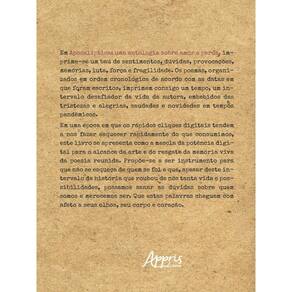 Em Apocalíptica: uma antologia sobre amor e perda, imprime-se um baú de sentimentos, dúvidas, provocações, memórias, luta, força e fragilidade. Os poemas, organizados em ordem cronológica de acordo com as datas em que foram escritos, imprimem consigo um tempo, um intervalo desafiador da vida da autora, embebidos das tristezas e alegrias, saudades e novidades em tempos pandêmicos. Em uma época em que os rápidos cliques digitais tendem a nos fazer esquecer rapidamente do que consumimos, este livro se apresenta como a mescla da potência digital para o alcance da arte e do resgate da memória viva da poesia reunida. Propõe-se a ser instrumento para que não se esqueça de quem se foi e que, apesar deste intervalo da história que roubou de nós tanta vida e possibilidades, possamos sanar as dúvidas sobre quem somos e merecemos ser. Que estas palavras cheguem com afeto a seus olhos, seu corpo e coração. Marca: ARTERA EDITORA