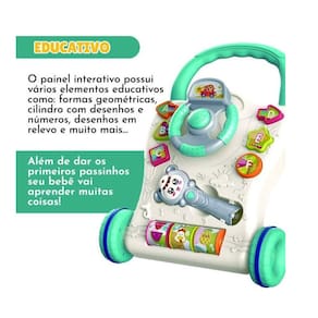 Estimula seu bebê a dar os primeiros passinhos; A frente tem atividades educativas para ensinar e divertir: pianinho, Lousa Mágica, espelho e muito mais, são 8 brinquedos para se divertir; Pode ser utilizado por bebês que já se sentam para brincar. Depois pode ser utilizado para bebês que já ficam em pé. Coordenação motora mãos, dedos, braços e pernas. Cores vibrantes, música, luzes e texturas chamam a atenção do bebê a ajudam a desenvolver os sentidos.