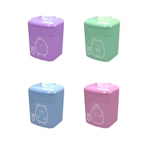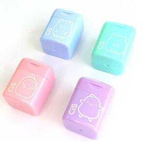 Apontador plástico mini com um furo, depósito pequeno e tons pastéis, além claro, desses desenhos super fofos!
