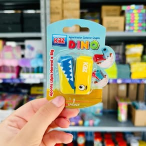 Detalhes do produto: Marca: kaz Modelo: apontador escolar dino kz1935bl Furos: 2 para lápis comum e lápis jumbo Depósito: coletor para resíduos integrados Material: resina termoplástica e lâmina de aço inox Atóxico: seguro para o uso infantil