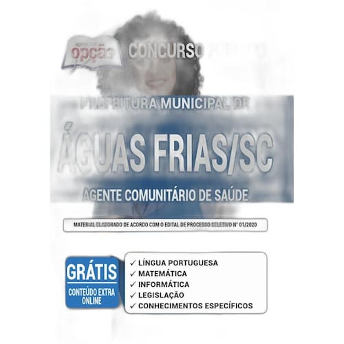 Apostila para Concurso Prefeitura Águas Frias - SC 2020 Para o Cargo de Agente Comunitário De Saúde A Apostila para Concurso Prefeitura Águas Frias - SC 2020 Para o Cargo de Agente Comunitário De Saúde foi elaborada de acordo com o Edital 01/2020, por professores especializados em cada matéria e com larga experiência em concursos. O conteúdo foi organizado, visando uma fácil assimilação do conteúdo e, assim, uma melhor otimização no tempo de aprendizagem.