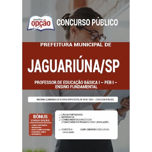 A Apostila Concurso Prefeitura de Jaguariúna - SP 2021 - Professor de Educação Básica I - PEB I - Ensino Fundamental contempla as seguintes matérias: Língua Portuguesa Matemática Conhecimentos Específicos Conhecimentos Pedagógicos e Legislação Conteúdo Complementar e Exclusivo: Legislação