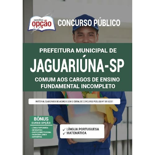 A Apostila Concurso Prefeitura de Jaguariúna - SP 2021 - Comum aos Cargos de Ensino Fundamental Incompleto contempla as seguintes matérias: Língua Portuguesa Matemática