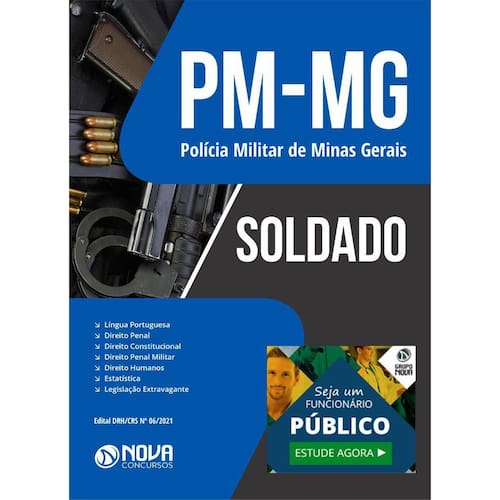 A Apostila Concurso PM-MG 2021 - Soldado contempla as seguintes matérias: Língua Portuguesa Direito Penal Direito Constitucional Direito Penal Militar Direito Humanos Estatística Legislação Extravagante
