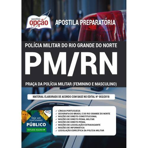 A Apostila Concurso PM-RN 2021 - Praça da Polícia Militar Feminino e Masculino contempla as seguintes matérias: Língua Portuguesa Geografia do Brasil e do Rio Grande do Norte Noções de Direito Constitucional Noções de Direito Penal Militar Noções de Direito Penal Noções de Legislação Extravagante Noções de Informática Legislação Específica da Polícia Militar