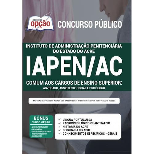 A Apostila Concurso IAPEN-AC 2021 - Comum aos Cargos de Ensino Superior: Advogado, Assistente Social e Psicólogo contempla as seguintes matérias: Língua Portuguesa Raciocínio Lógico Quantitativo História do Acre Geografia do Acre Conhecimentos Específicos - Gerais
