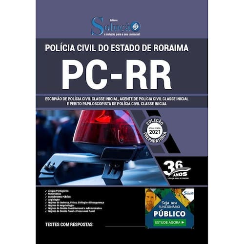 A Apostila Concurso PC-RR 2021 - Escrivão, Agente e Perito Papiloscopista - Classe Inicial contempla as seguintes matérias: Língua Portuguesa Matemática Atendimento ao Público Legislação Noções de Química, Física, Biologia e Biosegurança Noções de Arquivologia Noções de Direito Constitucional e Administrativo Noções de Direito Penal e Processual Penal Conteúdo Complementar e Exclusivo: Legislação Complementar