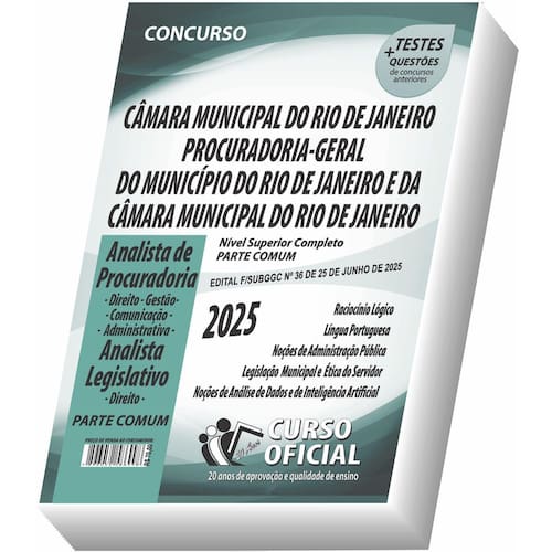 Edição impressa atualizada - elaborada por professores especializados em concursos públicos do curso oficial - são 25 anos de experiência e aprovação dedicados a você, . Cargos: Cargos da procuradoria - geral do município - pgm - analista de procuradoria - especialidade direito Analista de procuradoria - especialidade gestão - analista de procuradoria - especialidade comunicação - analista de procuradoria - especialidade administrativa Cargos da procuradoria-geral da câmara municipal do rio de janeiro - analista de procuradoria Cargos da câmara municipal do rio de janeiro - analista legislativo - especialidade direito Tipo: impressa Páginas: 250 Escolaridade: nível superior Órgão: câmara municipal do rio de janeiro - procuradoria-geral do município do rio de janeiro - procuradoria-geral da câmara municipal do rio de janeiro - edital f/subggc nº 36, de 25 de junho de 2025 Conteúdo do material: Conhecimentos gerais Raciocínio lógico Língua portuguesa Noções de administração pública Legislação municipal e ética do servidor Noções de análise de dados e de inteligência artificial parte comum a todos os cargos Você receberá ainda: Testes, provas e questões de concursos anteriores. Marca: Não Informado