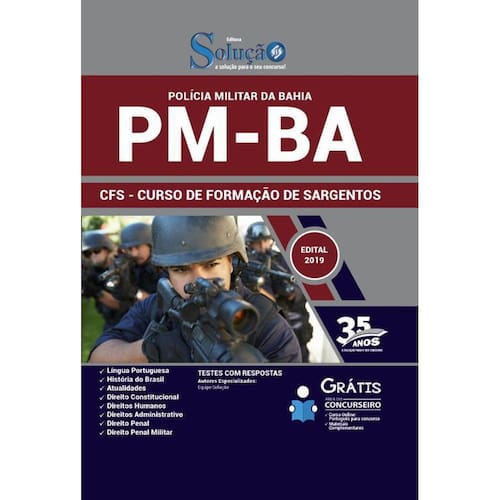 A Apostila PM-BA 2019 - CFS - Curso de Formação de Sargentos foi organizada para proporcionar um melhor rendimento na sua preparação, abordando cada conteúdo de forma clara. Estude para o Processo Seletivo da PM-BA 2019 com um material de acordo com o Edital oficial para o cargo de CFS - Curso de Formação de Sargentos. Características da Apostila:- Material Impresso;- 448 páginas;- Testes com respostas;- Conteúdo de acordo com o edital oficial de 2019.Matérias da Apostila:Língua Portuguesa;História do Brasil;Atualidades;Direito Constitucional;Direitos Humanos;Direito Administrativo;Direito Penal; Direito Penal Militar. Marca: Editora Solucao