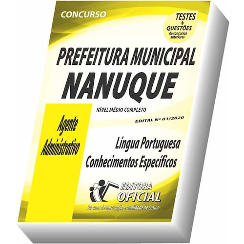 Edição Impressa Atualizada - Elaborada por professores especializados em concursos Públicos do Curso Oficial - São 20 anos de experiência e aprovação dedicados a você, . Cargo: AGENTE ADMINISTRATIVO Tipo: IMPRESSA Páginas: 251 Escolaridade: NÍVEL MÉDIO COMPLETO Órgão: Prefeitura Municipal de Nanuque - EDITAL N° 001/2020 Conteúdo do Material: Língua Portuguesa Conhecimentos Específicos Você receberá ainda: Testes, provas e questões de concursos anteriores; Atualizações, se houver alguma mudança no edital; Prova do último concurso; Edital do Concurso Marca: Não Informado