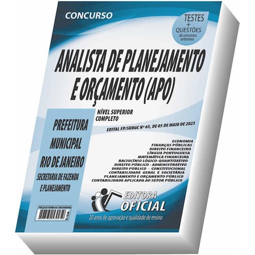Edição Impressa Atualizada – Elaborada por professores especializados em concursos Públicos do Curso Oficial – São 23 anos de experiência e aprovação dedicados a você, candidato.Cargo: Analista de Planejamento e Orçamento (APO)Tipo: IMPRESSAPáginas: 510Escolaridade: ENSINO SUPERIOR COMPLETOÓrgão: PREFEITURA MUNICIPAL DO RIO DE JANEIRO - SECRETARIA DE FAZENDA E PLANEJAMENTO MUNICÍPIO DO RIO DE JANEIRO - EDITAL FP/SUBGC Nº 65, DE 05 DE MAIO DE 2023Conteúdo do Material:ECONOMIADIREITO FINANCEIROFINANÇAS PÚBLICASLÍNGUA PORTUGUESAMATEMÁTICA FINANCEIRARACIOCÍNIO LÓGICO-QUANTITATIVODIREITO PÚBLICO - ADMINISTRATIVODIREITO PÚBLICO - CONSTITUCIONALCONTABILIDADE GERAL E SOCIETÁRIAPLANEJAMENTO E ORÇAMENTO PÚBLICOCONTABILIDADE APLICADA AO SETOR PÚBLICO NBC TSPVOCÊ RECEBERÁ AINDA:Testes, provas e questões de concursos anteriores;Atualizações, se houver alguma mudança no edital;Prova do último concurso;Edital do Concurso. Ean: 7898682128944