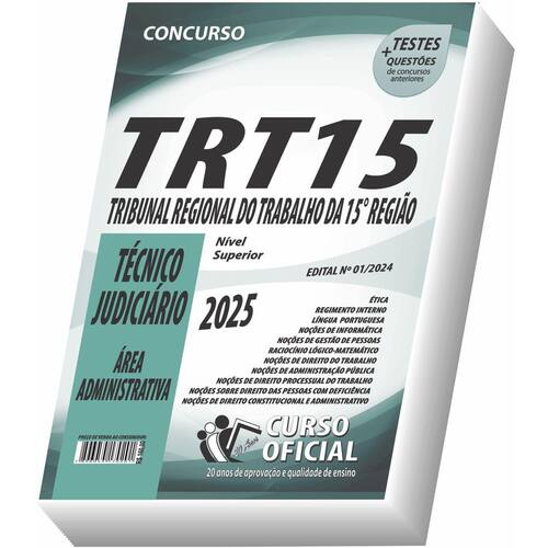 Edição impressa atualizada - elaborada por professores especializados em concursos públicos do curso oficial - são 23 anos de experiência e aprovação dedicados a você, . Cargo: técnico judiciário - área administrativa Tipo: impressa Páginas: 582 Escolaridade: nível superior Órgão: tribunal regional do trabalho da 15 região - edital 1/2024 Conteúdo do material: Ética Regimento interno Língua portuguesa Noções de informática Raciocínio lógico-matemático Noções de gestão de pessoas Noções de direito do trabalho Noções de administração pública Noções de direito processual do trabalho Noções sobre direito das pessoas com deficiência Noções de direito constitucional e administrativo Você receberá ainda: Testes, provas e questões de concursos anteriores; Atualizações, se houver alguma mudança no edital; Prova do último concurso; Edital do concurso. Marca: Não Informado Ean: 7908831303488